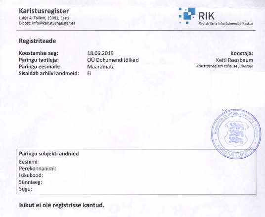 Бюро переводов "Толмач" оказывает услугу получения справки о судимости в Эстонии (выписка из пенитенциарного регистра). Получить справку можно как лично, так и через нашего представителя в Эстонии. В выписке указывается отсутствие или наличие данных о наказаниях в пенитенциарном регистре лица, относительно которого делается запрос.